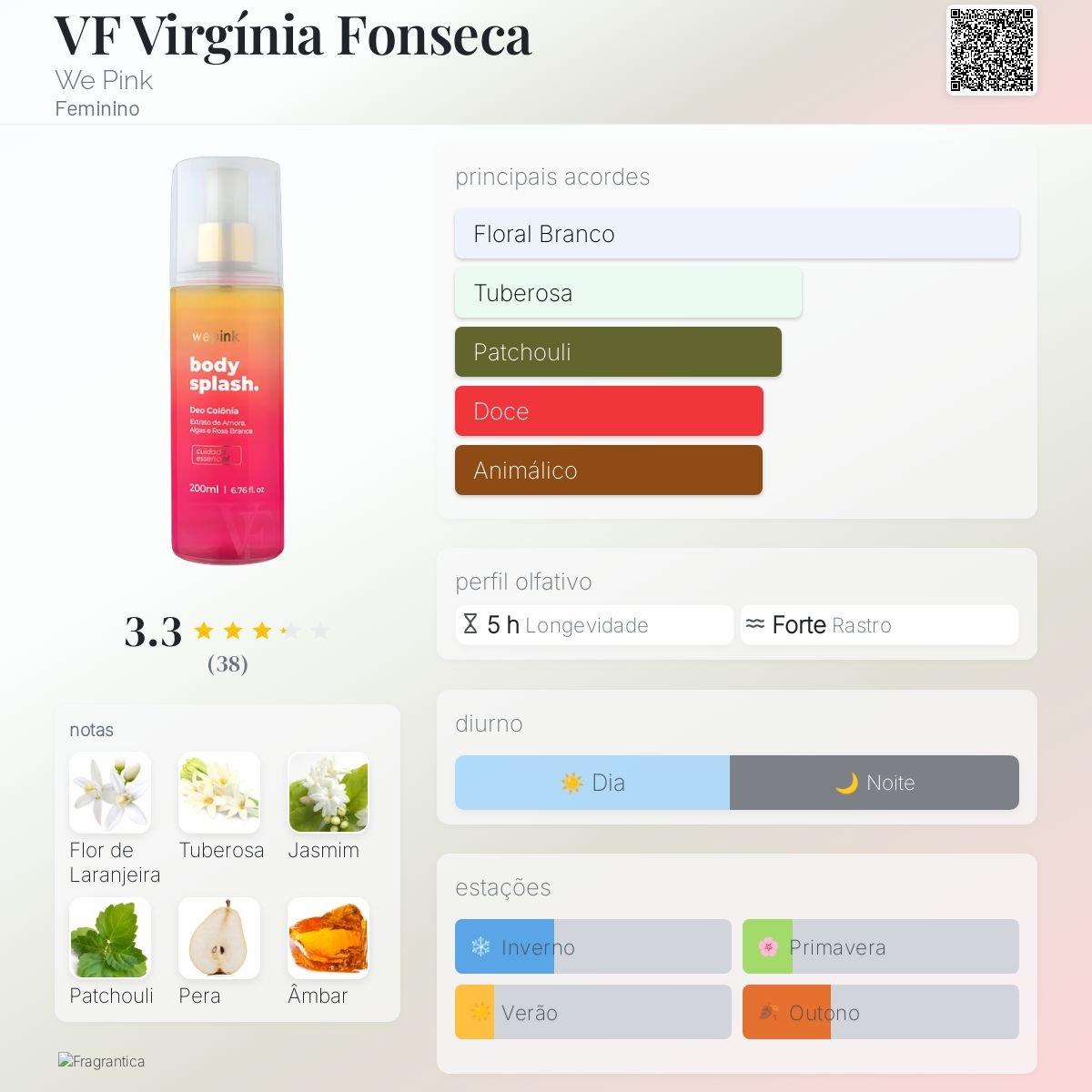 VF Virgínia Fonseca de We Pink é um perfume Oriental Floral Feminino. VF Virgínia Fonseca foi lançado em 2023. As notas de topo são: Flor de Laranjeira e Pera. As notas de coração são: Tuberosa e Jasmim. As notas de fundo são: Patchouli e Âmbar.