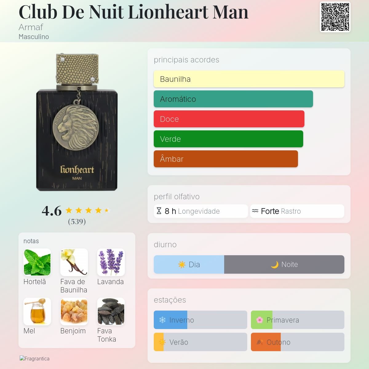 Club De Nuit Lionheart Man de Armaf é um perfume Oriental Fougére Masculino. Esta é uma nova fragrância. Club De Nuit Lionheart Man foi lançado em 2025. As notas de topo são: Hortelã e Lavanda. As notas de coração são: Baunilha e Benjoim. As notas de fundo são: Mel, Fava Tonka e Tabaco.