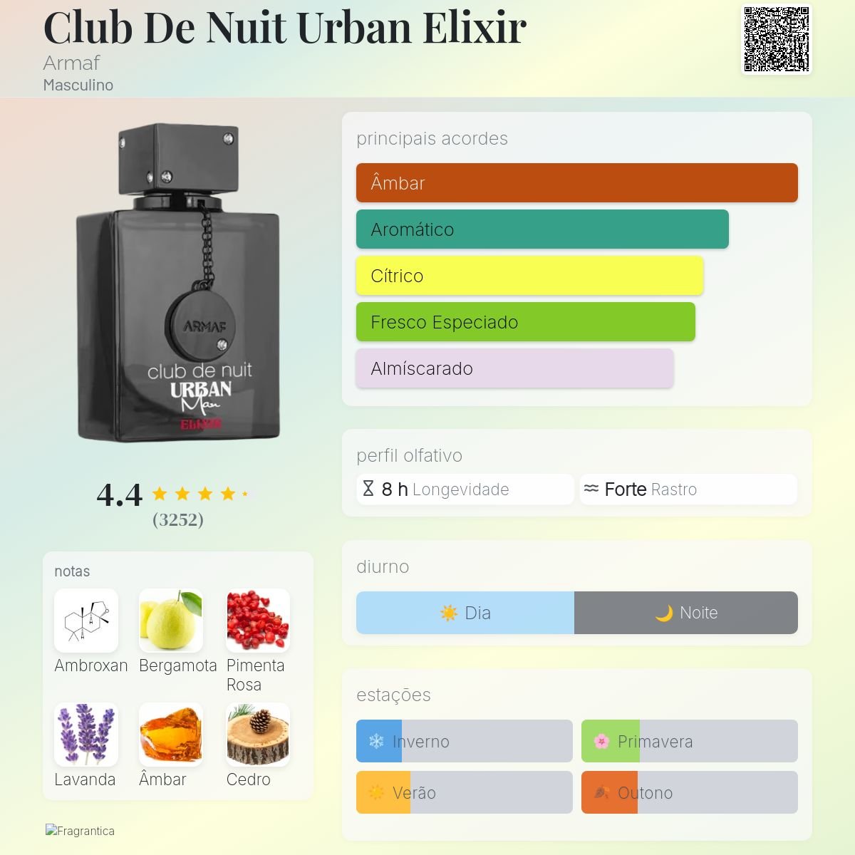Club De Nuit Urban Elixir de Armaf é um perfume Masculino. Club De Nuit Urban Elixir foi lançado em 2022. As notas de topo são: Bergamota, Pimenta Rosa, Flor de Laranjeira e Jasmim. As notas de coração são: Lavanda, Elemi, Gerânio, Vetiver, Açafrão e Tagetes. As notas de fundo são: Ambroxan, Âmbar, Cedro, Patchouli e Ládano.