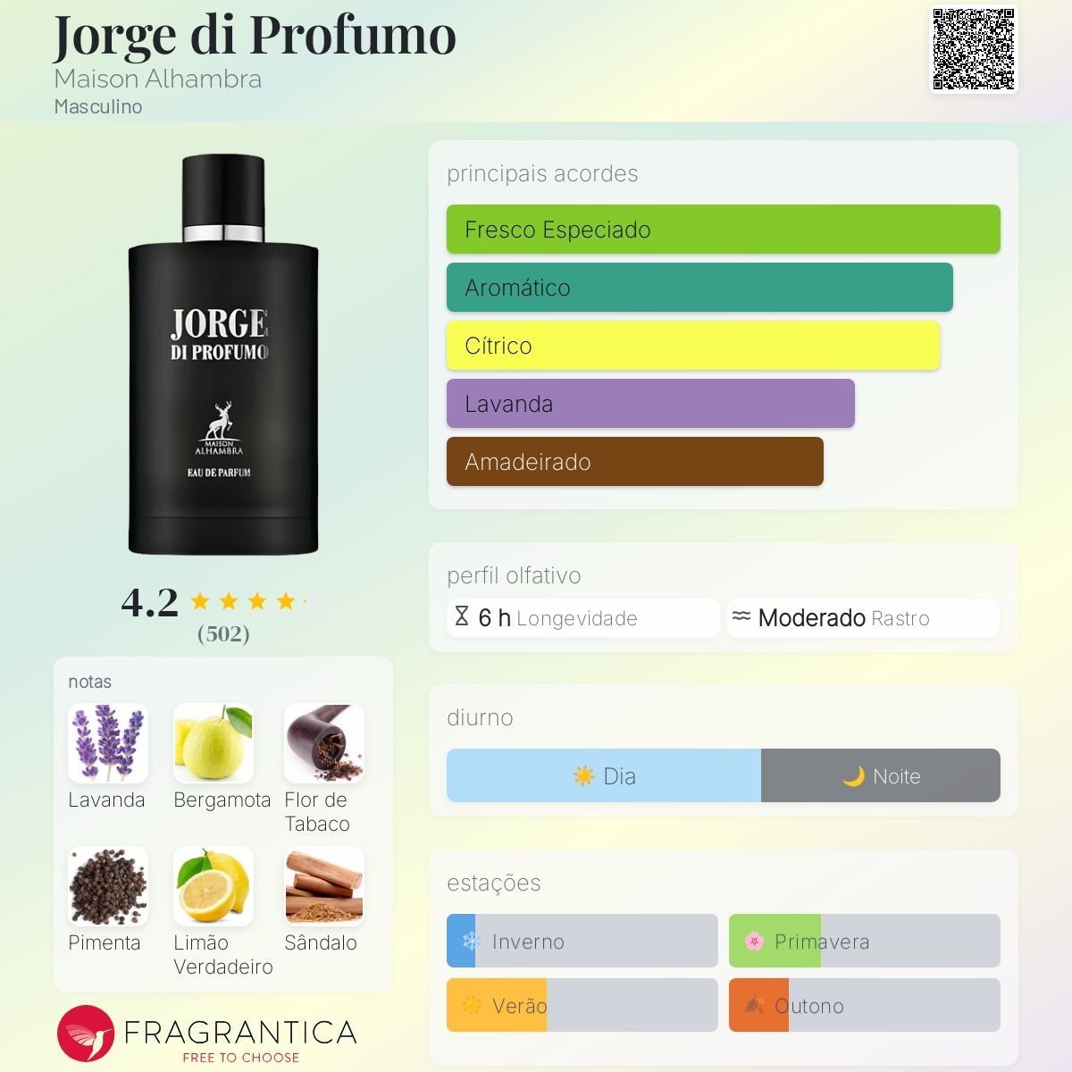 Jorge di Profumo de Maison Alhambra é um perfume Aromático Masculino. Jorge di Profumo foi lançado em 2022. As notas de topo são: Bergamota, Pimenta Preta e Limão Siciliano. As notas de coração são: Lavanda, Tabaco e Gerânio. As notas de fundo são: Sândalo, Vetiver e Almíscar.