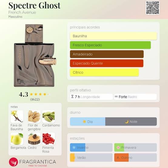 Perfume Spectre Ghost Masculino 100ml — uma fragrância envolvente que une mistério e elegância para homens que desejam marcar presença com sofisticação. Com notas amadeiradas e especiadas, o Spectre Ghost é ideal para qualquer ocasião, do dia a dia a eventos especiais. Sua fixação prolongada garante uma experiência olfativa única e duradoura.